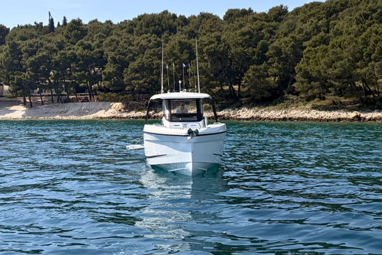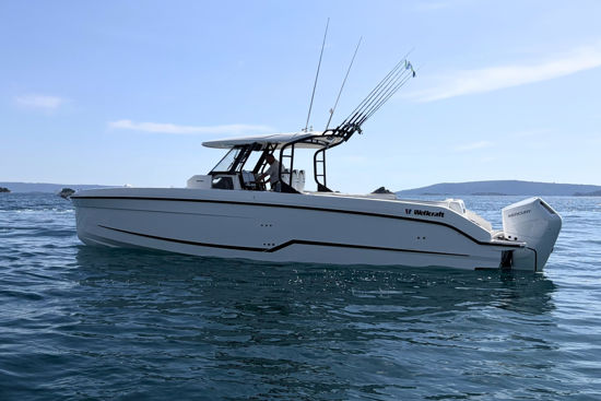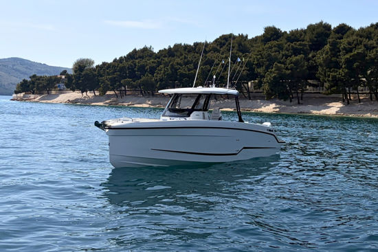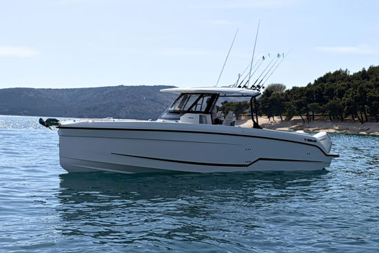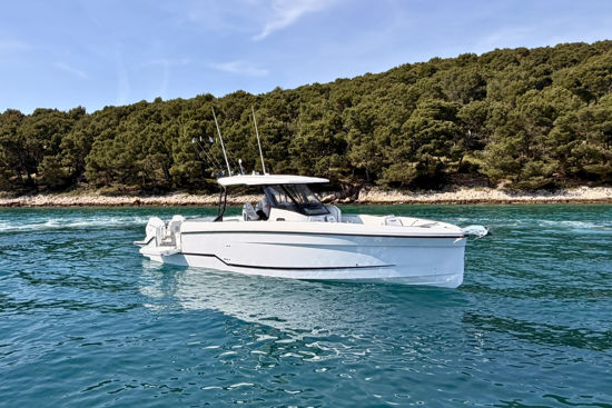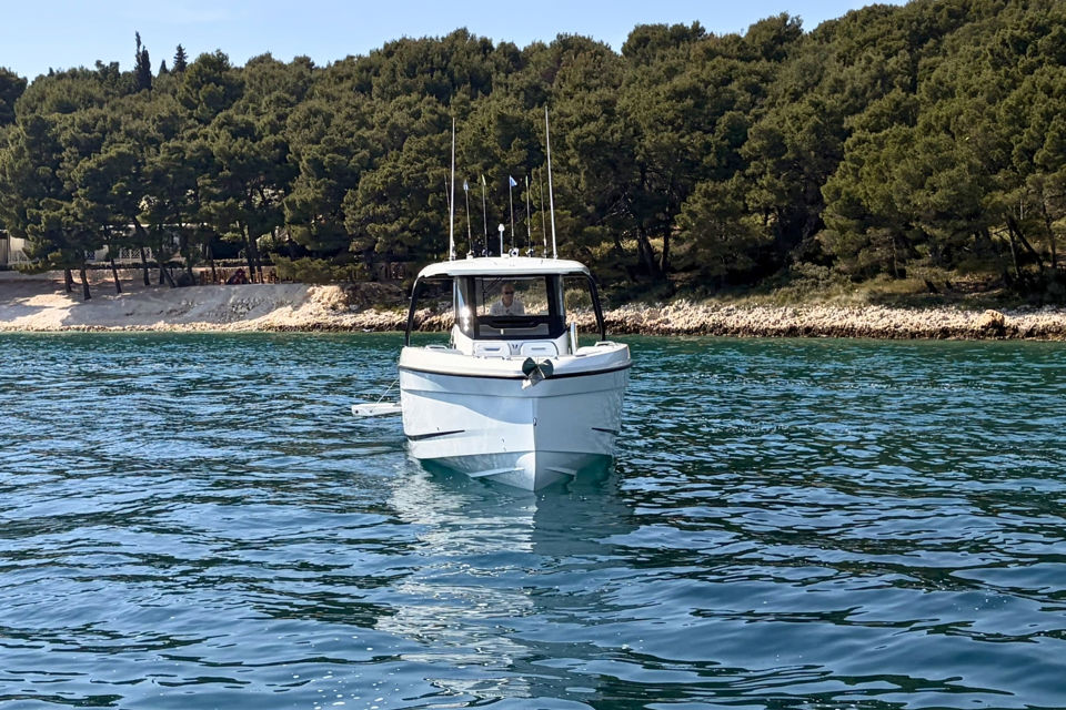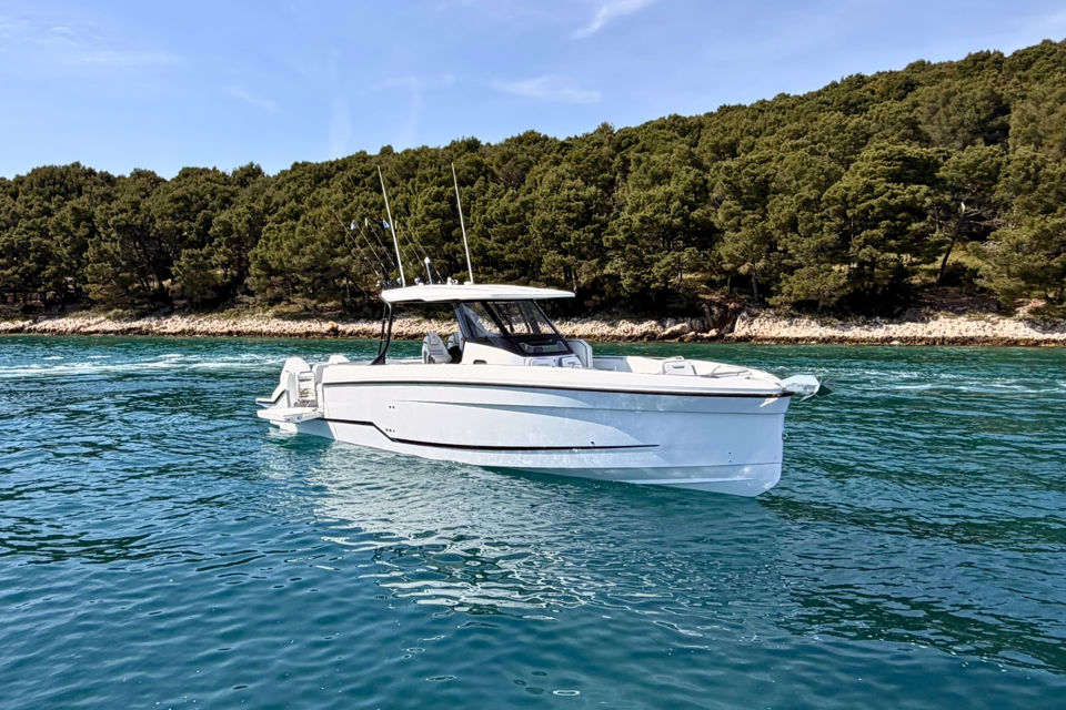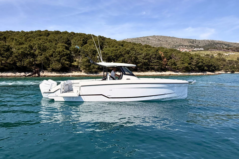 Inovativna krmena platforma s ljestvama, T-top s mekanim grafitnim zatvaranjem i ambijentalna rasvjeta po mjeri dodatno naglašavaju funkcionalnost i eleganciju, dok joystick upravljanje i promjenjivi pramčani potisnik omogućuju precizno manevriranje u svim uvjetima.