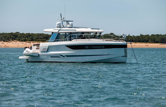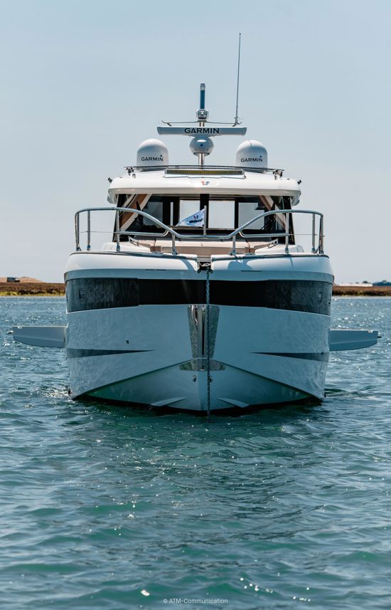 The Trim Level Premiere includes a bow thruster, electric trim flaps, cockpit lights, and a Fusion/JL audio system. Optional packs enhance your voyage: Electronic Pack with dual Garmin GPSMAP 8416 XSVs, Premium Audio Pack, and Comfort Pack with multifunction steering wheel and ambient lighting.