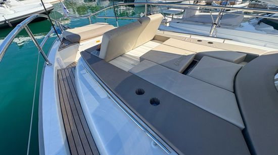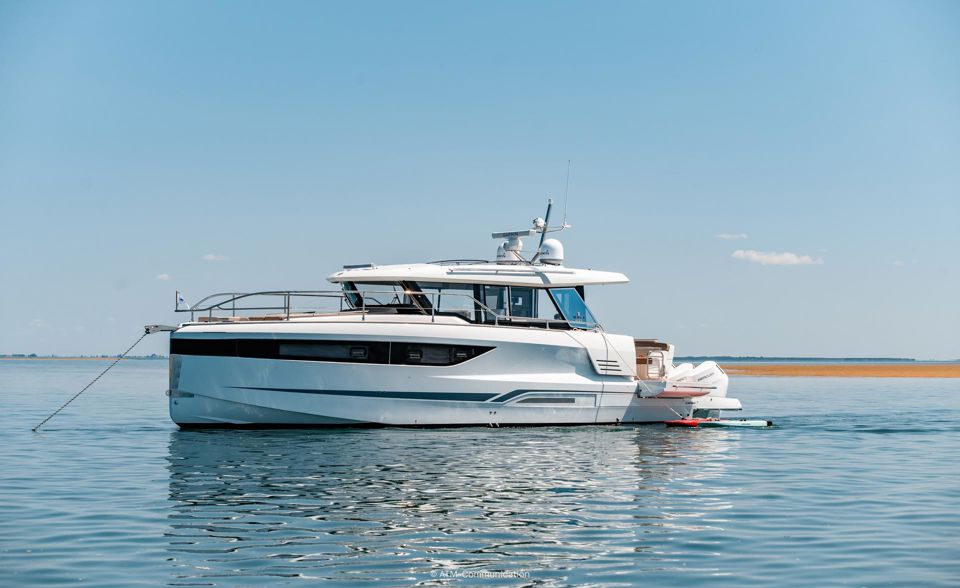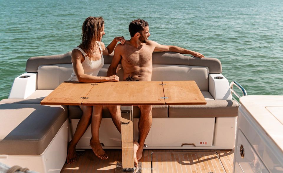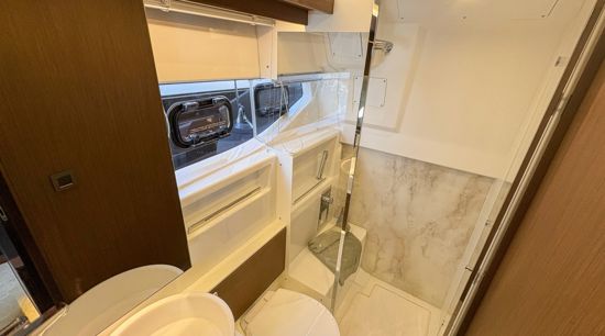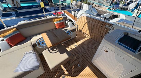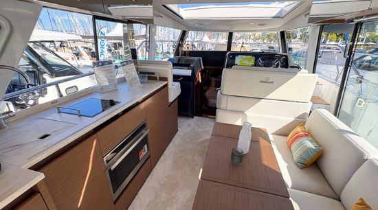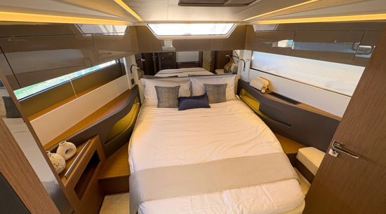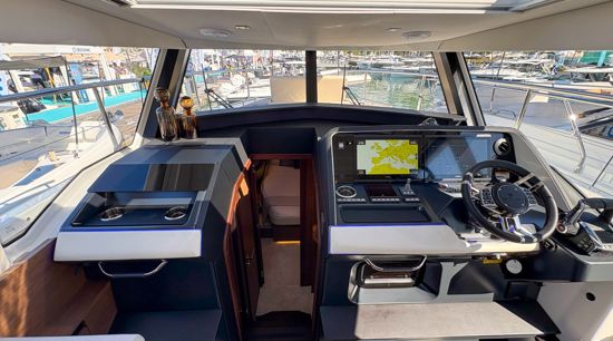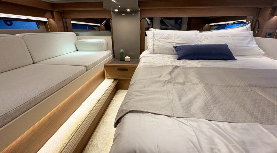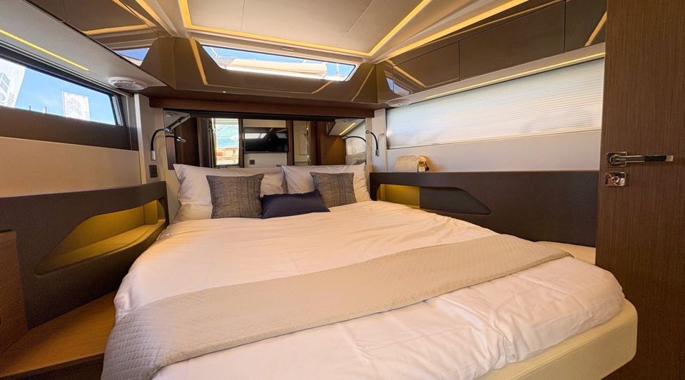 Step inside to a fully air-conditioned saloon with a Vitroceramic cooktop, or dine al-fresco in the cockpit with fold-down terraces. The bow lounge, with removable table and shade, offers the perfect sunset vantage. Below deck, two private cabins with ensuite heads and walk-in showers accommodate up to four guests.