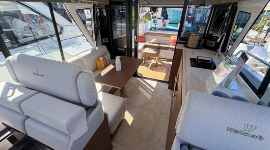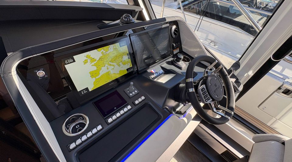 Designed for those who crave exploration without compromising comfort, the Wellcraft 44 Explorer features an enclosed pilothouse and deep-V hull, inspiring confidence offshore. Powered by triple Mercury Verado V10 350 HP engines with joystick control, it delivers effortless performance and agility.