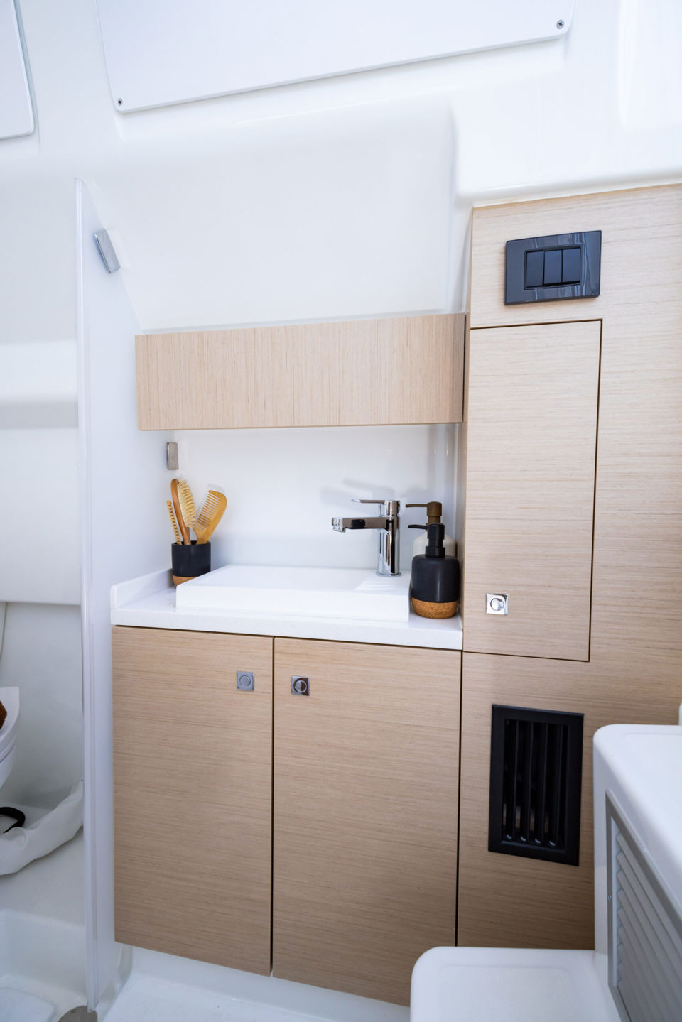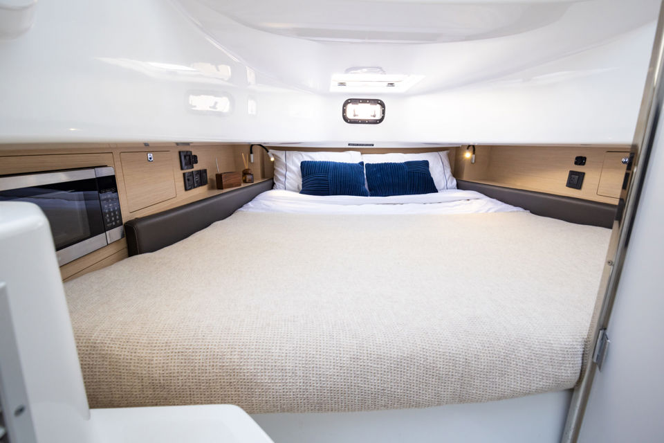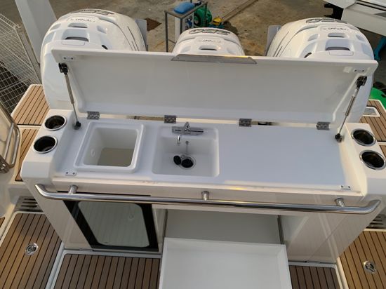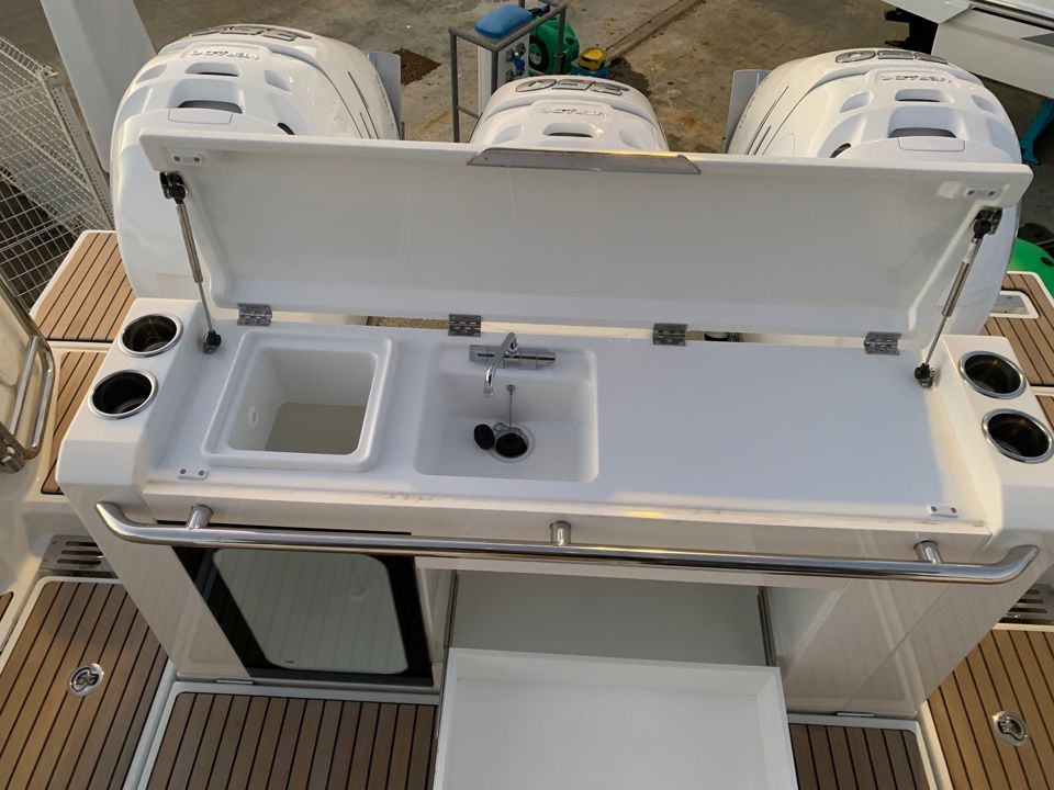 This model truly stands out for its wide range of optional equipment, allowing every owner to tailor the boat to their lifestyle — from engine configurations with twin or triple Mercury or Yamaha power options, to an impressive selection of premium upholstery, advanced navigation systems, high-end JL/Fusion audio, fishing and anchoring packages, and comfort upgrades such as air conditioning, Seakeeper stabilizer, or lithium battery systems.